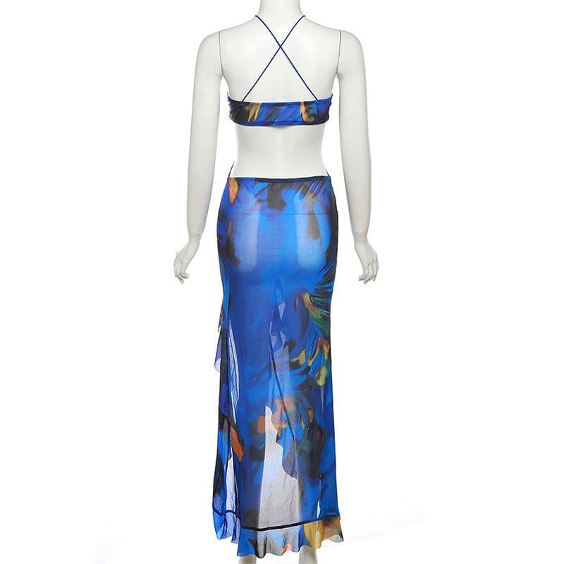Be the first to review “Cross front backless sheer mesh see through slit contrast print maxi dress”