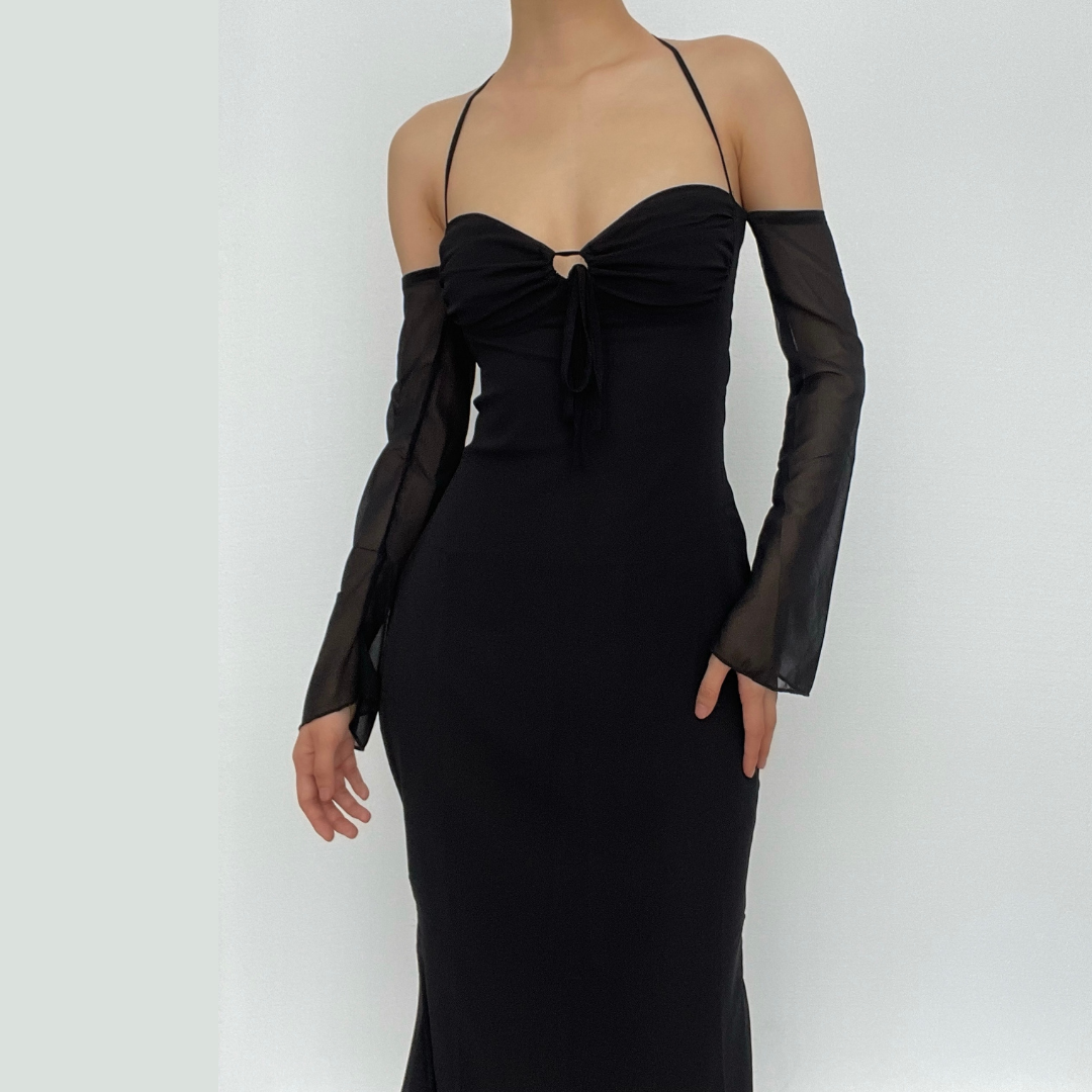 Be the first to review “Low cut halter off shoulder long flared sleeve midi dress”